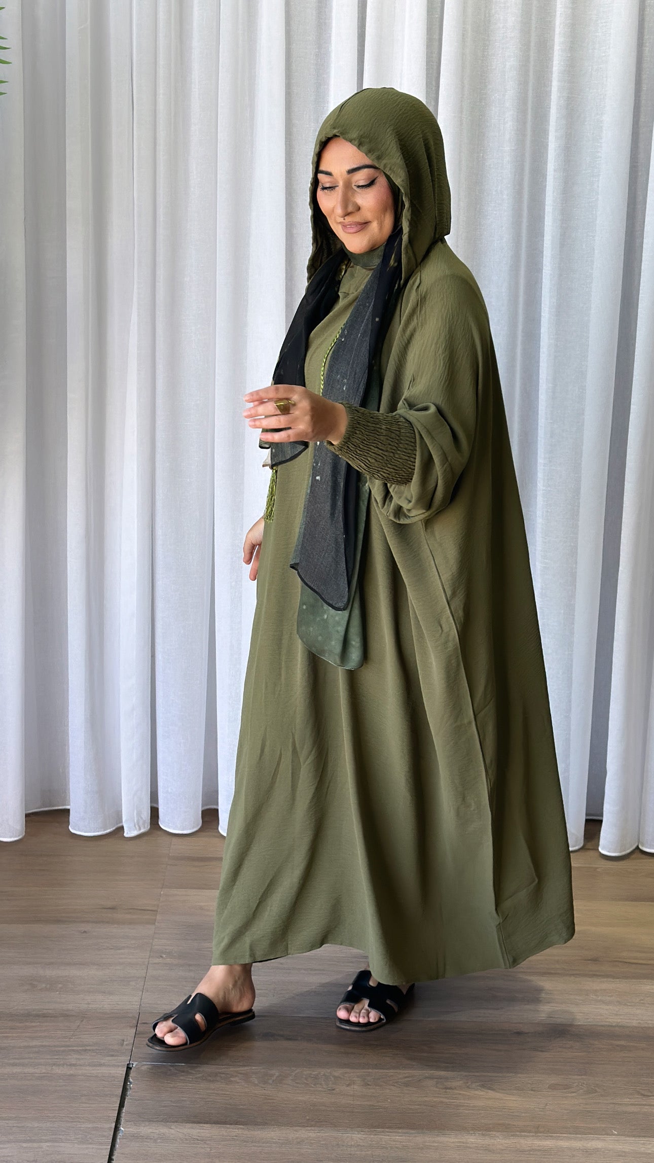 Description: The Umrah Abaya is a MUST HAVE abaya. It is a hooded abaya with a built-in cap. It has batwing sleeves and elastic cuff wrists. Ideal for Umrah as it is amazing for extreme heat. Even perfect as a prayer outfit.