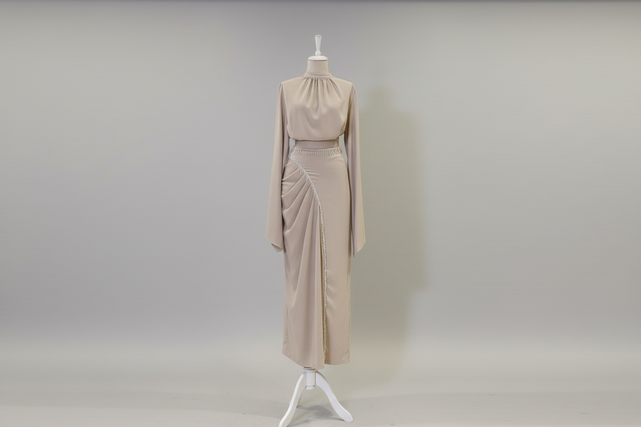 Description: The Violet Dress is a Beautiful Dress. The skirt set features an elegant long arm design with a slit at the bottom of the arm with diamante details. There are also diamante details below the hips on the skirt and ruching on the side of the skirt with diamante details below that.